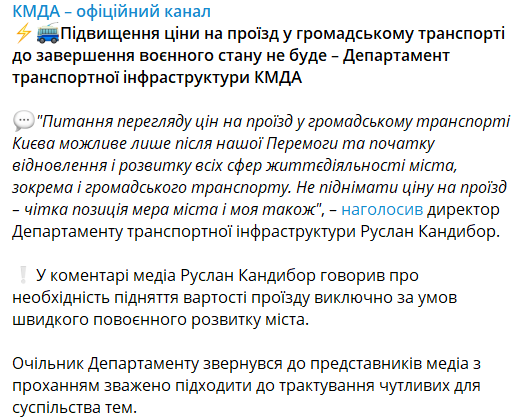"Вопрос пересмотра цен на проезд в общественном транспорте Киева возможен только после нашей победы и начала восстановления и развития всех сфер жизнедеятельности города, в том числе и общественного транспорта. Не поднимать цену на проезд - четкая позиция мэра города и моя также", - заявил Кандибор.