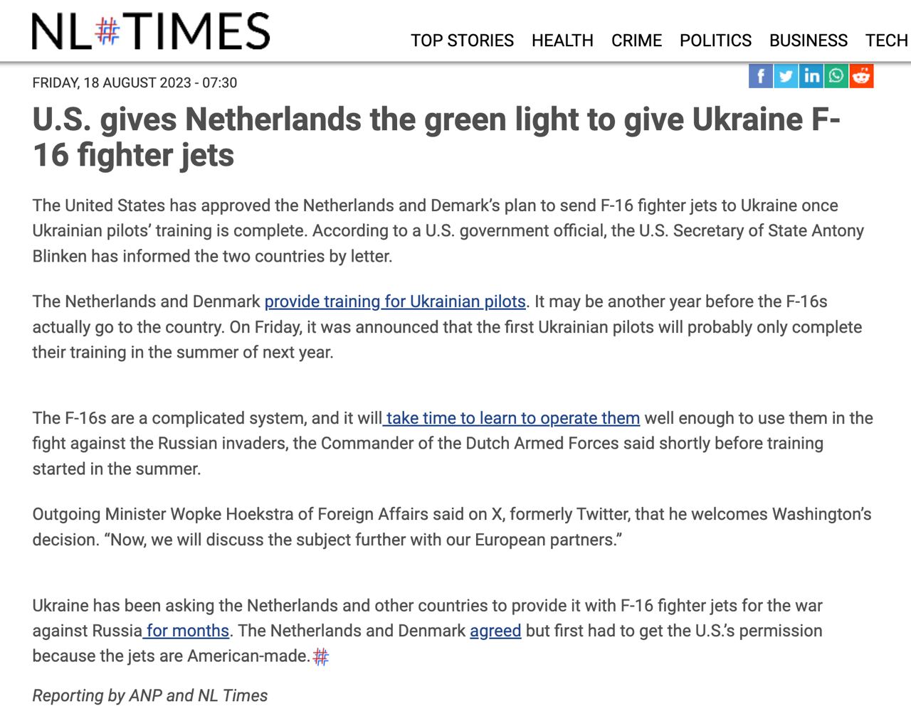 Перед этим США одобрили передачу Украине истребителей F-16 из Дании и Нидерландов, отметив, что это случиться после завершения подготовки украинских пилотов.
