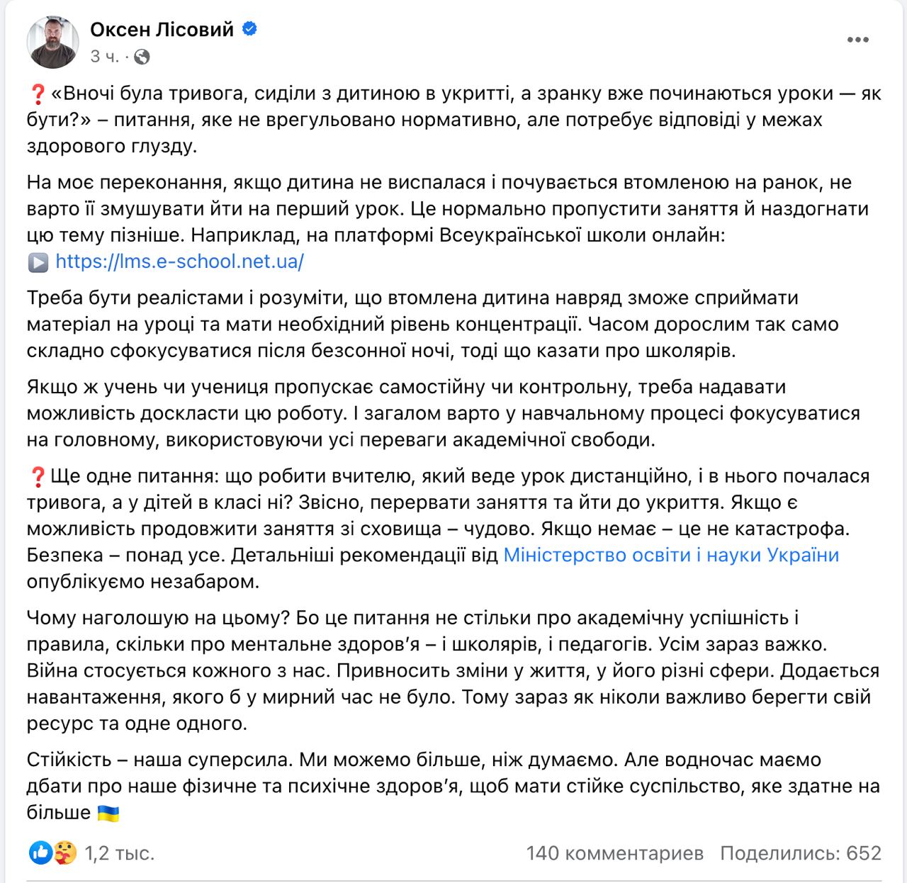 Об этом написал в Фейсбуке министр образования Оксен Лисовый.