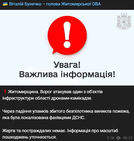 09:23 В Житомирской области ночью был атакован дроном один из объектов инфраструктуры.