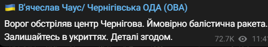 11:50 Глава Черниговской ОВА Чаус заявил, что россияне ударили по центру Чернигова балистичными ракетами.