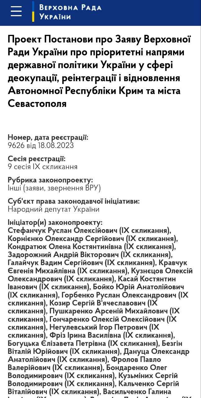 Такой тезис прописан в проекте постановления Верховной Рады, который вчера внесла в парламент широкая группа нардепов из разных фракций. Один из соавторов - спикер Руслан Стефанчук. Также под проектом подписались вице-спикеры Александр Корниенко и Елена Кондратюк.