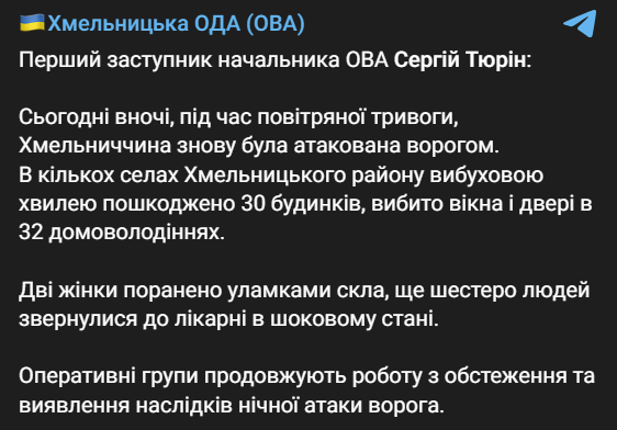 Сегодня ночью Россия атаковала беспилотниками Хмельницкую область. В нескольких селах Хмельницкого района взрывной волной повредило 30 домов, выбило окна и двери в 32 домовладениях.