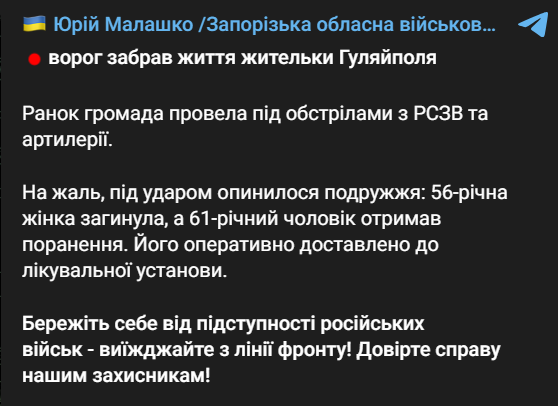 Сегодня утром оккупанты в очередной раз обстреляли Запорожскую область из РСЗО и артиллерии. Из-за обстрела в Гуляйполе погибла женщина.