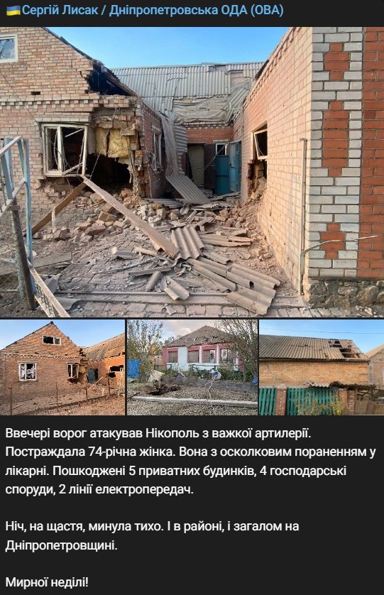09:00  Вчера вечером россияне атаковали Никополь Днепропетровской области из тяжелой артиллерии. В результате обстрела есть пострадавшая женщина.