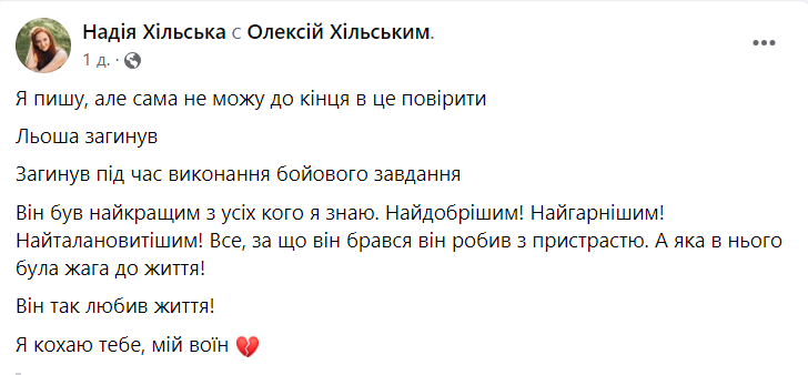 11:23 На фронте погиб украинский киноактер Алексей Хильский. Он воевал в 46-й отдельной аэромобильной бригаде в должности главного сержанта взвода разведроты.