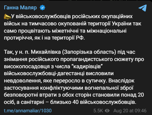 "Так, в населенном пункте Михайловка во время съемок российского пропагандистского сюжета о чиновнике из числа "кадыровцев" военнослужащие-дагестанцы выразили недовольство, которое переросло в столкновение", - объяснила замминистра обороны.