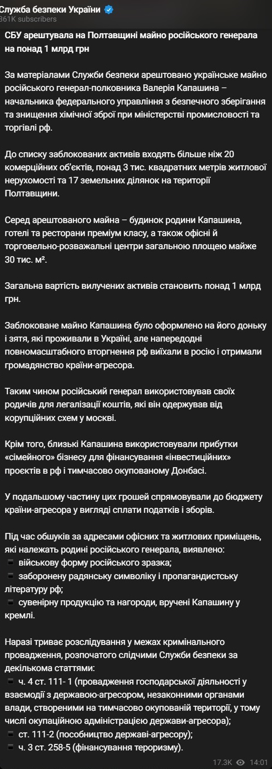 В Полтавской области арестовано имущество дочки и зятя российского генерала более чем на миллиард гривен. По данным СБУ, это имущество российского генерал-полковника Валерия Капашина, а на его семью оно было просто оформлено с целью легализации.