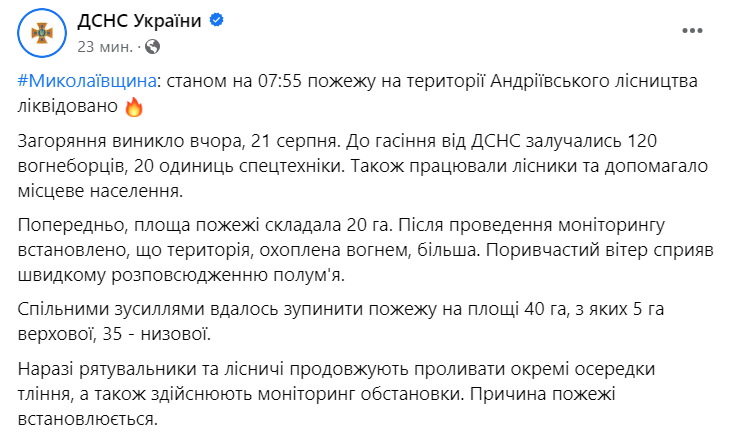 В Николаевской области ликвидировали масштабный пожар на территории Андреевского лесничества.