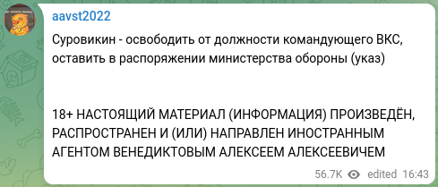 Также в российских военных телеграм-каналах Суровикина обвиняли в том, что он, не имея на то оснований, настоял на выводе российских войск с правого берега Днепра.