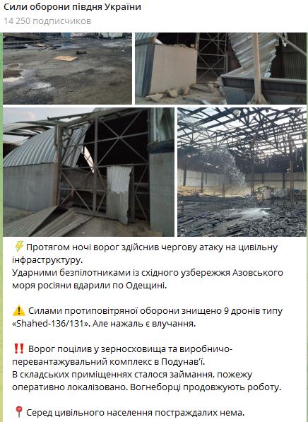 Этой ночью "Шахеды" попали в зернохранилища и производственно-перегрузочный комплекс в районе Дуная на территории Одесской области.