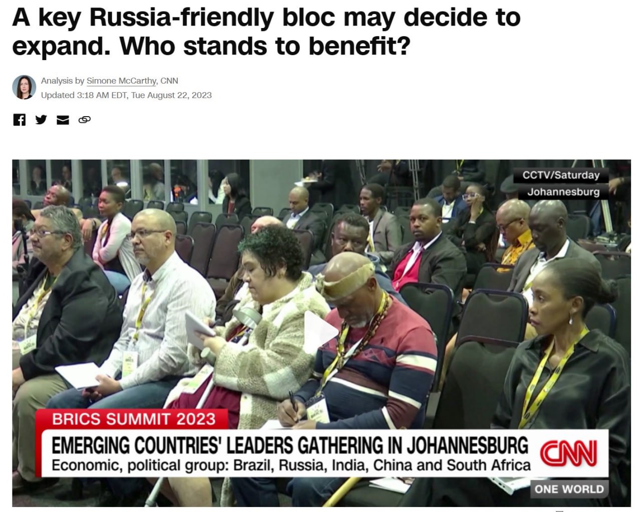 Присутствие России в организации, куда многие хотят войти, "указывает на увеличивающийся разрыв между приоритетами тех стран, которые выстраиваются в очередь в БРИКС, и богатых западных стран, которые объединились против Путина в поддержку Украины".