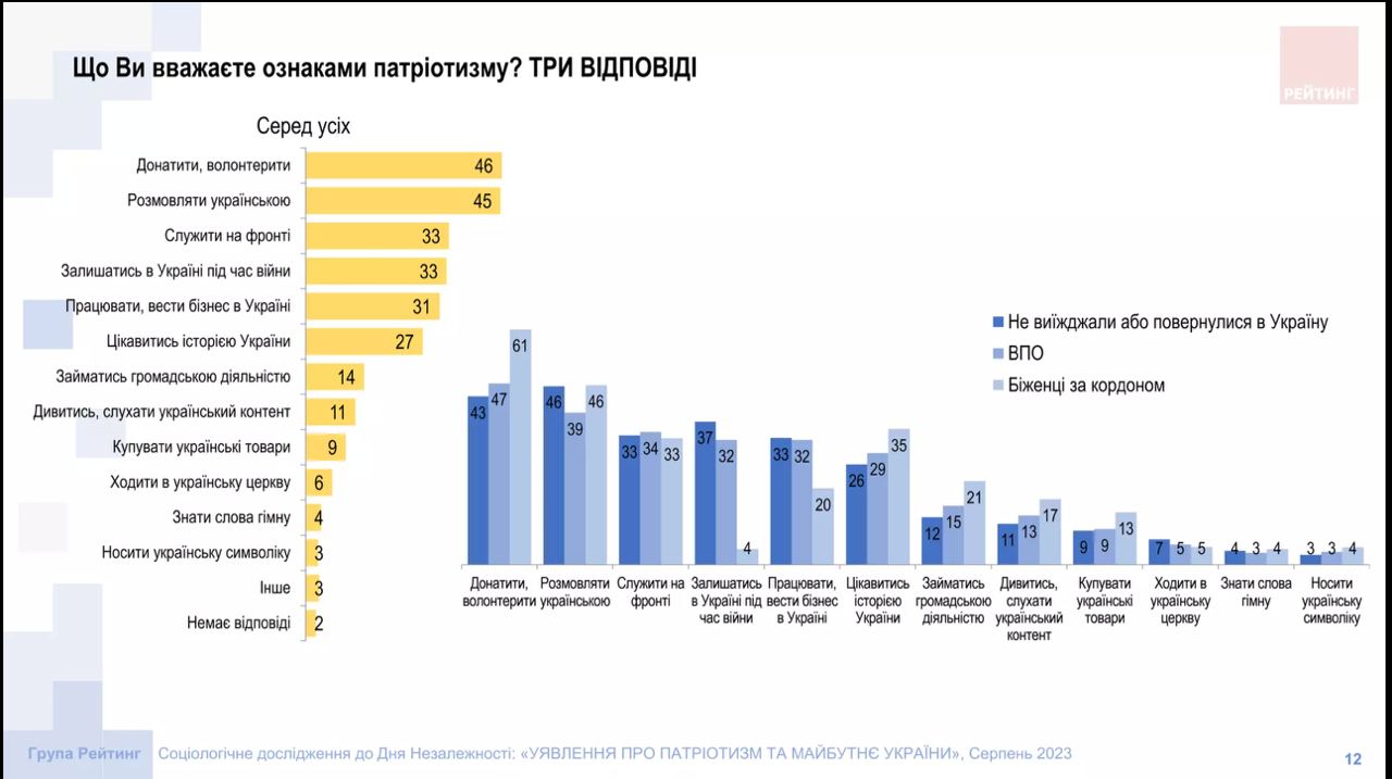 Выбрать можно было три ответа из предложенных. Пункт "донатить\волонтерить" выбрало 46% опрошенных, "говорить на украинском" - 45%, служить на фронте - 33%, оставаться в Украине во время войны - 33%, заниматься гражданской деятельностью - 14%, ходить в украинскую церковь - 6%.