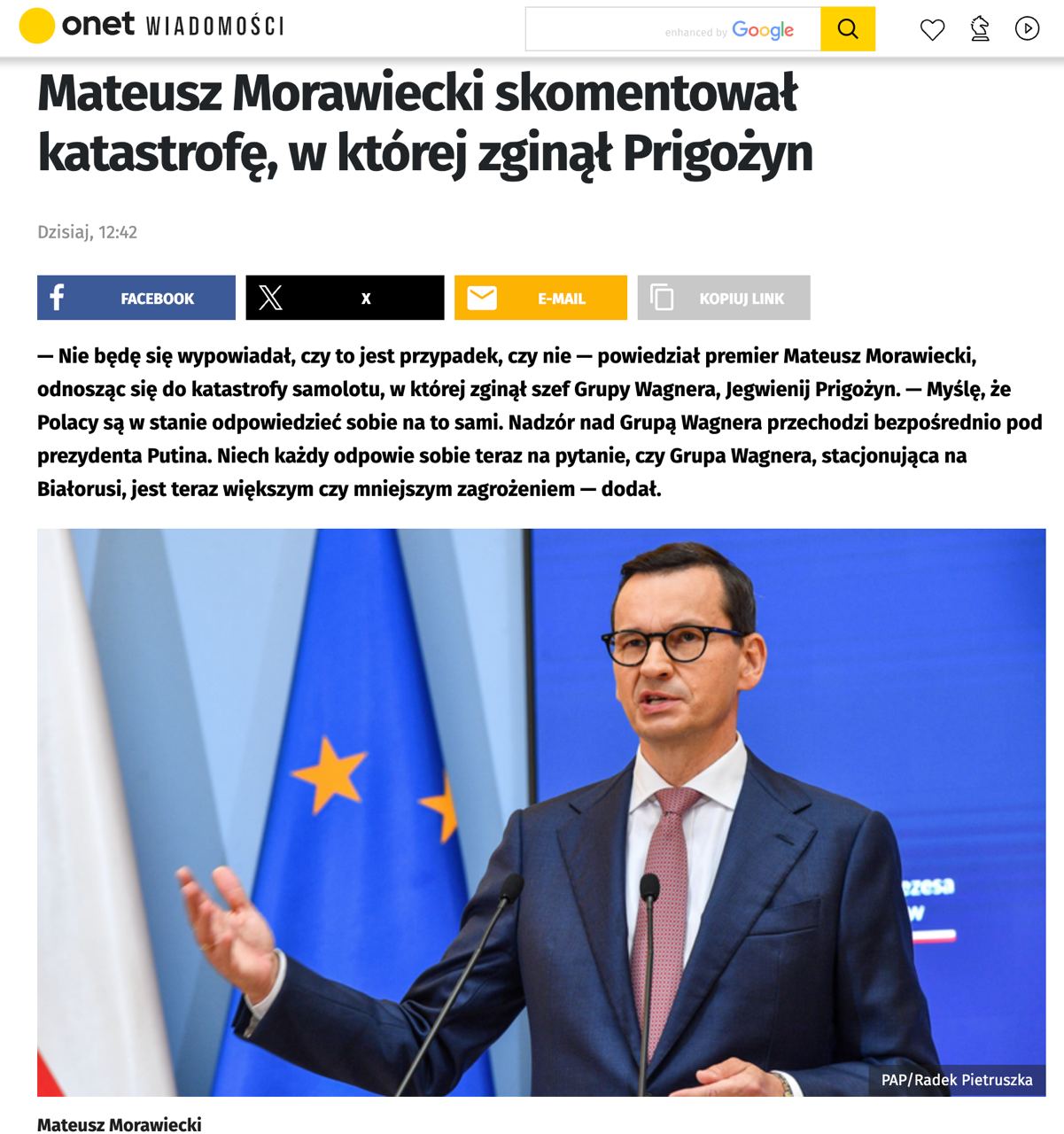 "Я не буду комментировать, совпадение это или нет. Думаю, поляки способны ответить на это сами. Кураторство над группой Вагнера переходит непосредственно к президенту Путину. Пусть каждый сам для себя ответит, становится ли теперь группа Вагнера, которая дислоцируется в Беларуси, большей или меньшей угрозой", – заявил премьер.