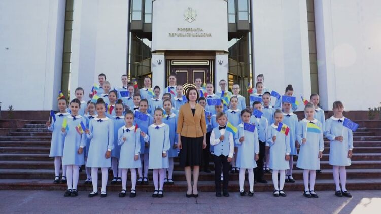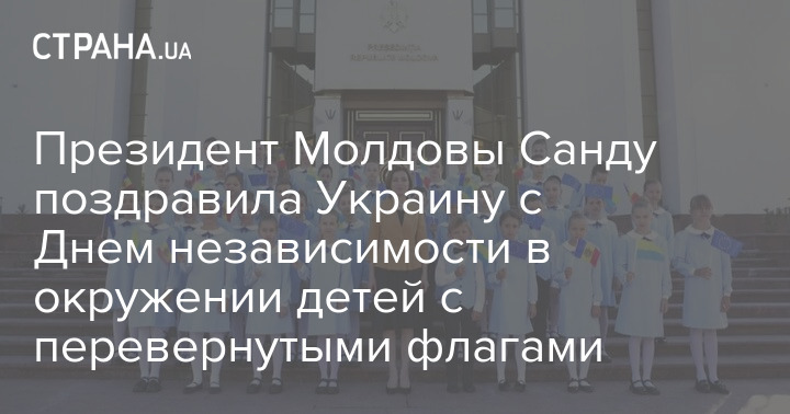Президент Молдовы Майя Санду поздравила Украину с Днем независимости в окружении детей, державших в руках перевернутые флаги Украины.
