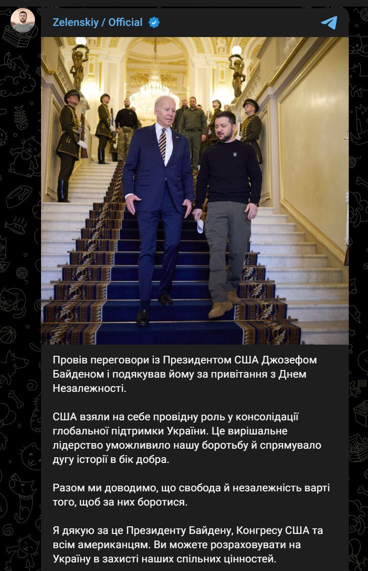 "Провел переговоры с Президентом США Джозефом Байденом и поблагодарил его за поздравление с Днем Независимости", - написал украинский президент и добавил, что в ходе беседы поблагодарил США за оказанную помощь.