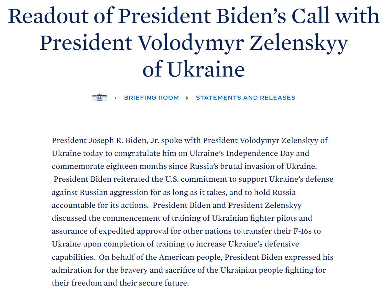 Кроме того Байден и Зеленский "обсудили начало подготовки украинских летчиков-истребителей и обеспечение ускоренного разрешения другим странам на передачу своих F-16 Украине после завершения обучения".