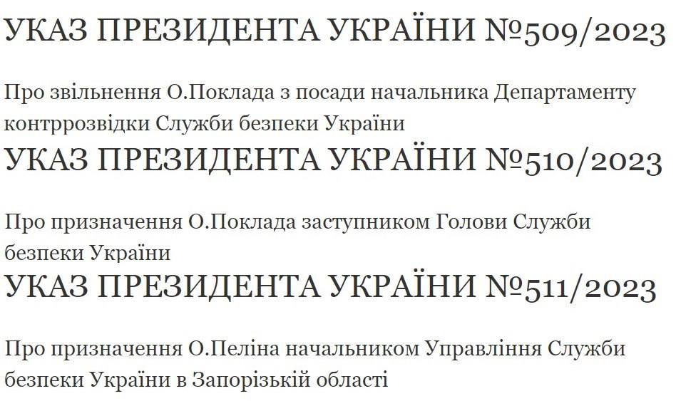 Первым указом от 23 августа 2023 года президент уволил Поклада с должности начальника департамента контрразведки СБУ. А вторым назначил его заместителем председателя СБУ.