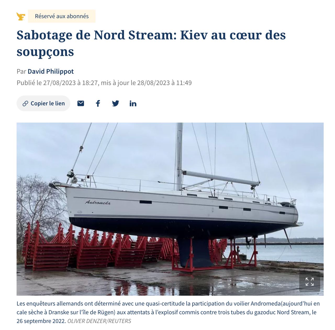 По данным Le Figaro, аренду яхты "Андромеда", с которой предположительно закладывалась взрывчатка, оплатило варшавское туристическое агентство Feeria Lwowa, руководителем которого является 54-летняя Наталия А., проживающая в Киеве.