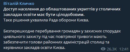 Доступ населения к обустроенным укрытиям в столичных учебных заведениях должен быть круглосуточным. Такое решение принял Совет обороны Киева.