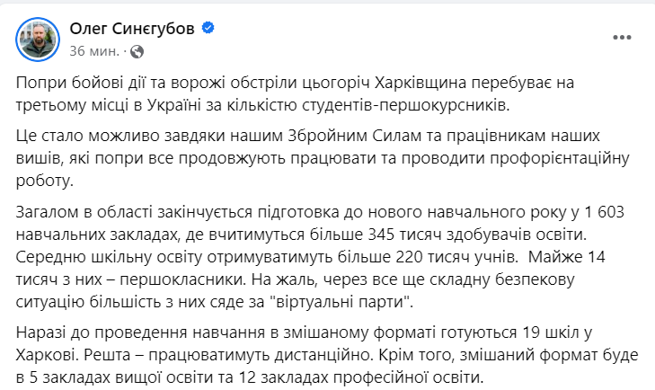 "В области заканчивается подготовка к новому учебному году в 1603 учебных заведениях, где будут учиться более 345 тысяч молодых людей. Среднее школьное образование будут получать более 220 тысяч учащихся. Почти 14 тысяч из них – первоклассники. К сожалению, из-за все еще сложной ситуации безопасности большинство из них сядет за "виртуальные парты"", - написал Синегубов.