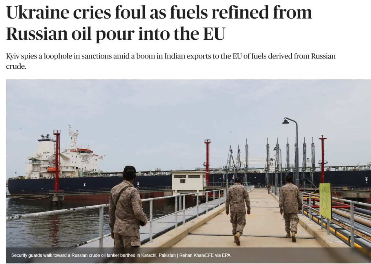 Сообщается, что его продают в ЕС Китай, Индия и Турция, которые скупают российскую сырую нефть и перерабатывают ее в бензин и керосин.