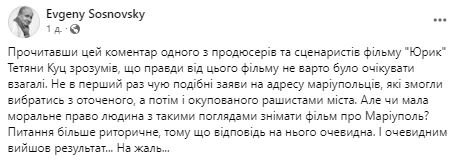 "Имел ли моральное право человек с такими взглядами снимать фильм о Мариуполе? Вопрос более риторический, потому что ответ на него очевиден. И очевидным получился результат", - написал на своей странице в Facebook фотограф из Мариуполя Евгений Сосновский.
