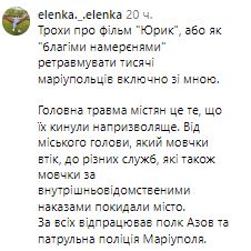 "Мариупольцы пошли на референдум (в мае 2014 года - Ред.) и проголосовали за РФ. Теперь РФ убивает не только мариупольцев, но мы за вас бьемся тоже", - заявила она в ответ на критику фильма.