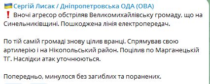 07.52 Ночью РФ обстреляла Великомихайловскую громаду в Синельниковском районе Днепропетровской области. Повреждена линия электропередач.