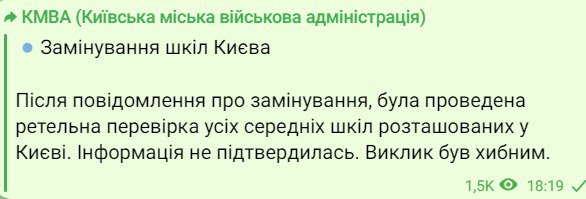 18.25 Информация о минировании киевских школ оказалась ложной. Об этом сообщила КГГА после проверки всех школьных зданий.