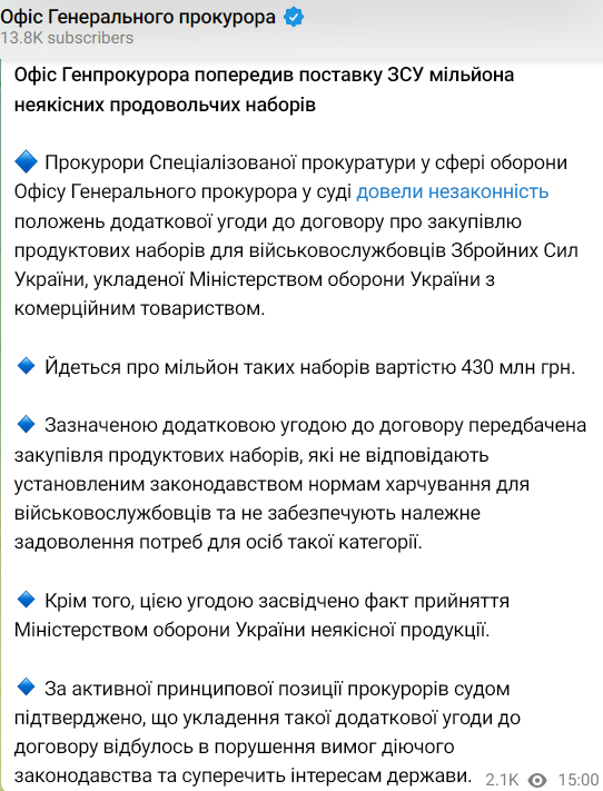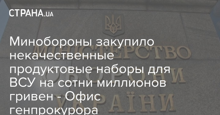 Прокуратура доказала в суде незаконность договора Министерства обороны Украины с частной компанией о закупке миллиона продуктовых наборов для ВСУ на 430 млн грн.