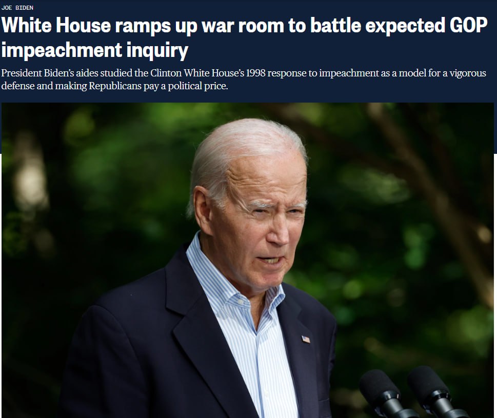 Отмечается, что Белый дом начал готовиться к импичменту еще с первого дня работы палаты представителей конгресса США в ее нынешнем составе под контролем Республиканской партии, однако только с августа привлеченные советники принялись исследовать позицию своих политических противников для выработки ответа.