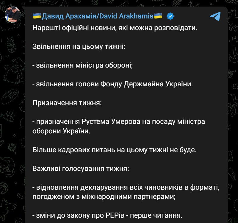 Об этом сообщил в своем телеграм-канале глава фракции "Слуги народа" в парламенте Давид Арахамия.