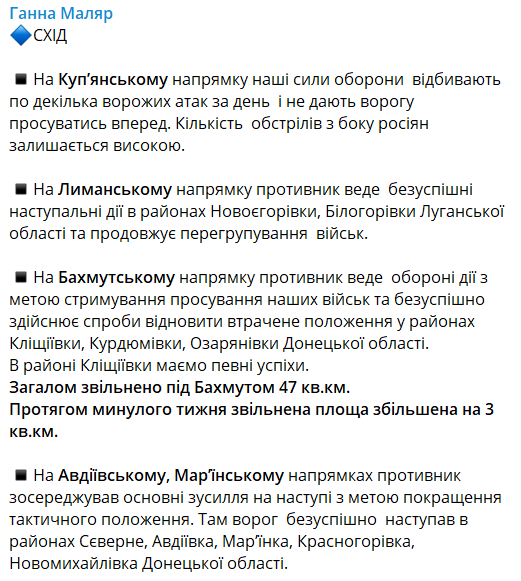 "На Бахмутском направлении противник ведет оборонные действия с целью сдерживания продвижения наших войск и безуспешно предпринимает попытки восстановить утраченное положение в районах Клещеевки, Курдюмовки, Озаряновки Донецкой области", - написала Маляр.
