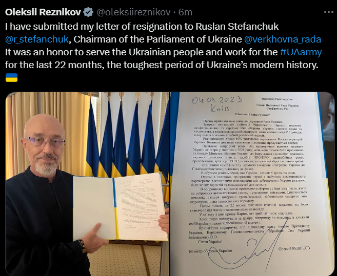В понедельник, 4 сентября, министр обороны Алексей Резников сообщил, что подал в Верховную Раду заявление о своей отставке.