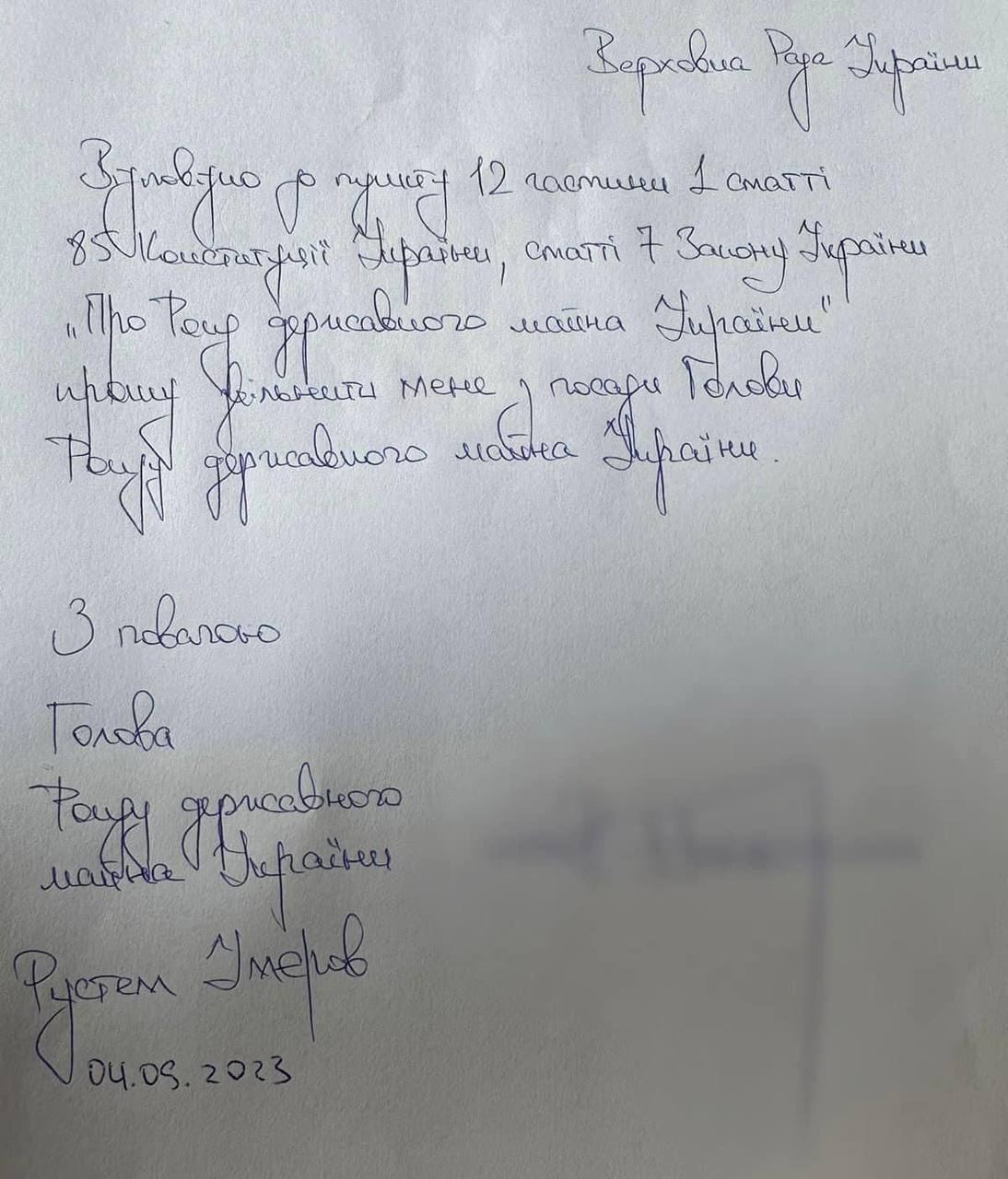 Умеров подал в Раду заявление об увольнении с должности главы Фонда госимущества