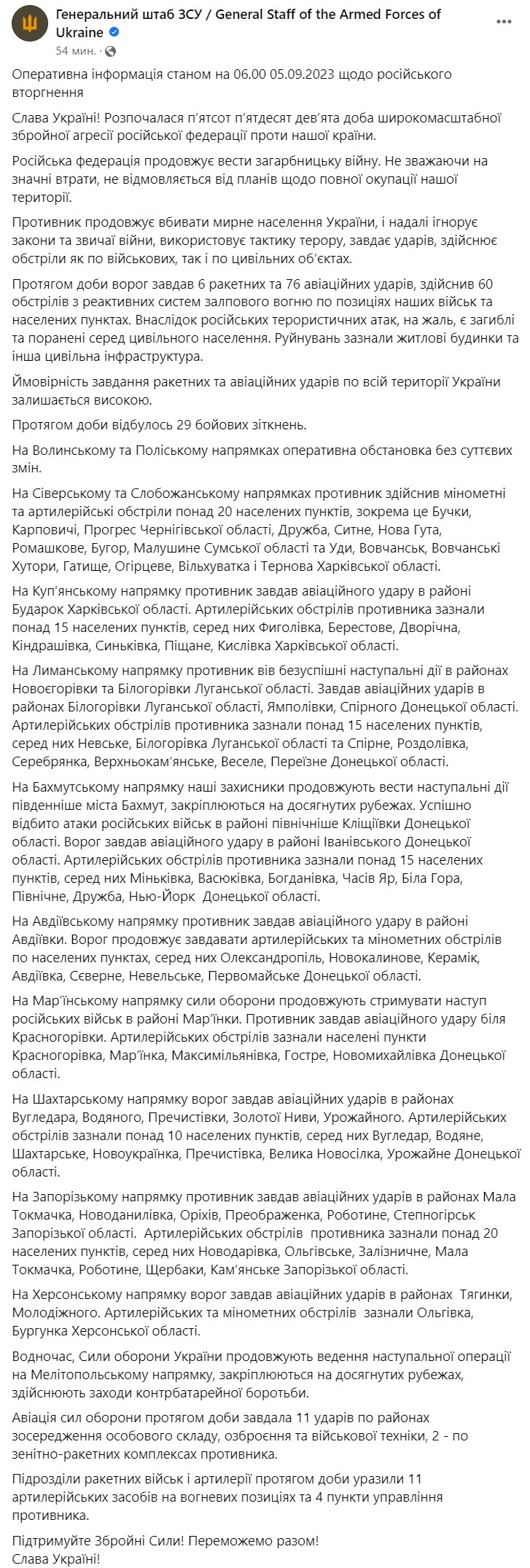 В течение суток враг нанес 6 ракетных и 76 авиационных ударов, совершил 60 обстрелов из реактивных систем залпового огня по позициям наших войск и населенным пунктам. В течение суток произошло 29 боевых столкновений.