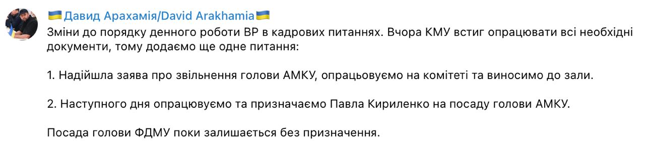 "Должность главы Фонда госимущества пока остается без назначения", - написал Арахамия.