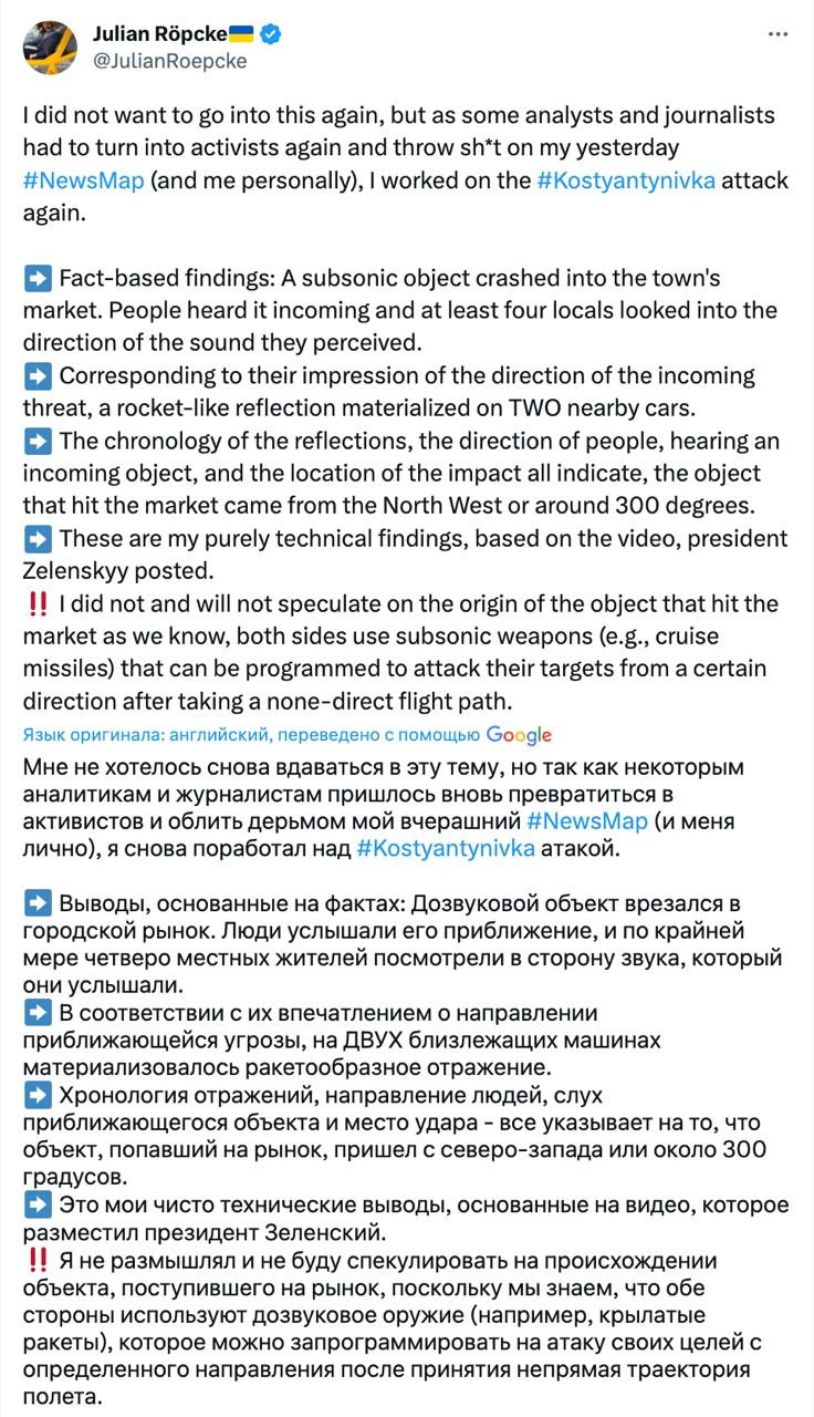 11:50 Военный обозреватель немецкого BILD Юлиан Рёпке утверждает, что ракета вчера прилетела в Константиновку с северо-запада. То есть со стороны территории, подконтрольной Украине.