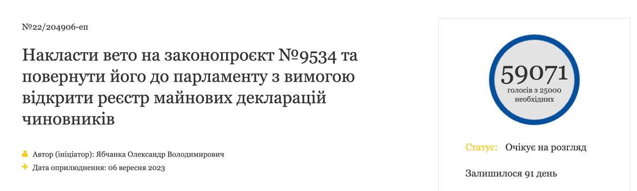 Петиция на сайте президента Украины с призывом открыть реестр деклараций украинских депутатов и чиновников меньше чем за сутки набрала 60 тысяч подписей. Хотя для ее рассмотрения Владимиром Зеленским было достаточно 25 тысяч.