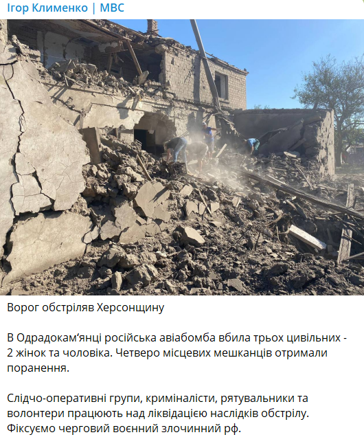 "В Отрадокаменке российская авиабомба убила троих гражданских - 2 женщин и мужчину. Четверо местных жителей получили ранения", - Клименко.