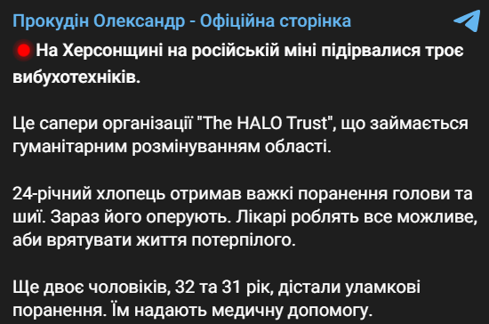 В Херсонской области на российской мине подорвались трое взрывотехников. Пострадали сапёры организации "The HALO Trust", они занимаются гуманитарным разминированием области. Один из них находится в тяжелом состоянии.