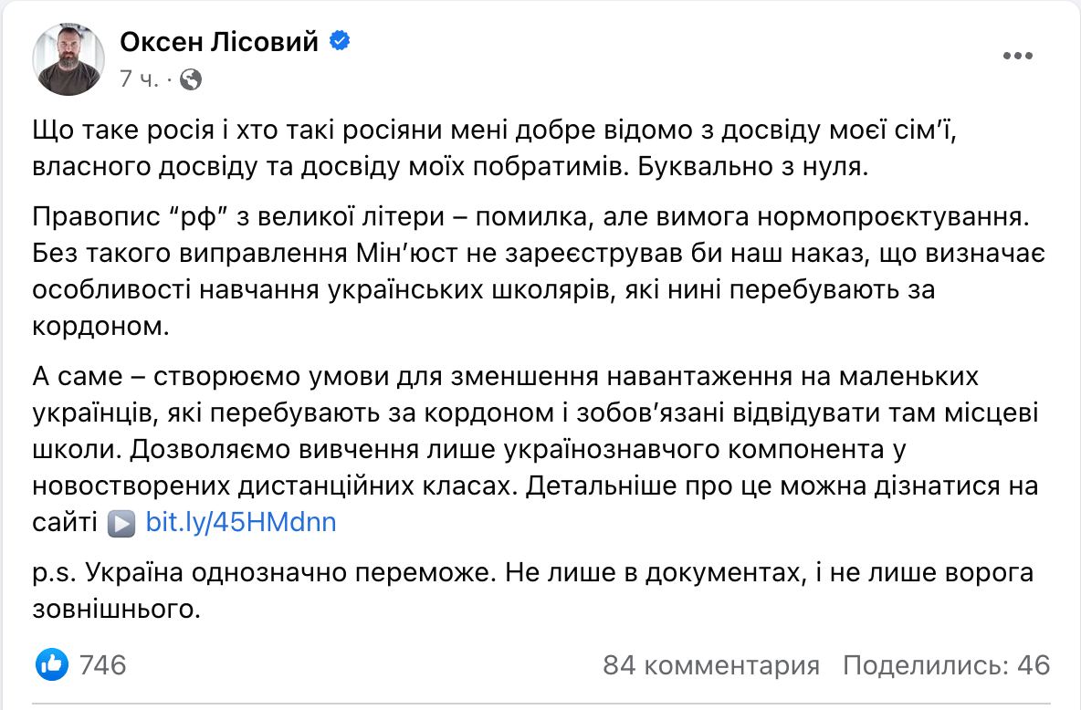 "Что такое Россия и кто такие россияне, мне хорошо известно из опыта моей семьи, собственного опыта и опыта моих собратьев. Правописание "РФ" с заглавной буквы – ошибка, но требование нормопроектирования. Без такой поправки Минюст не зарегистрировал бы наш приказ, определяющий особенности обучения украинских школьников, ныне находящихся за границей", – пояснил министр.