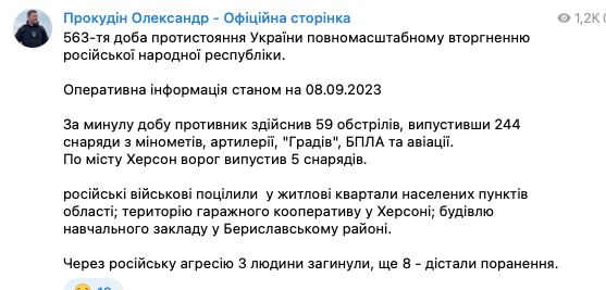 Противник совершил 59 обстрелов, выпустив 244 снаряда из минометов, артиллерии, "Градов", БПЛА и авиации. По городу Херсон враг выпустил 5 снарядов.