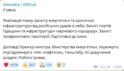 "Реализация плана по защите энергетики и критической инфраструктуры от российских ударов с неба. Защита портов Одесской области и инфраструктуры "зернового коридора". Защита прифронтовых территорий. Подготовка к зиме", - написал Зеленский.