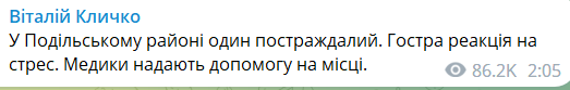 "В Подольском районе один пострадавший. Острая реакция на стресс. Медики оказывают помощь на месте", - сообщил мэр Киева Виталий Кличко.