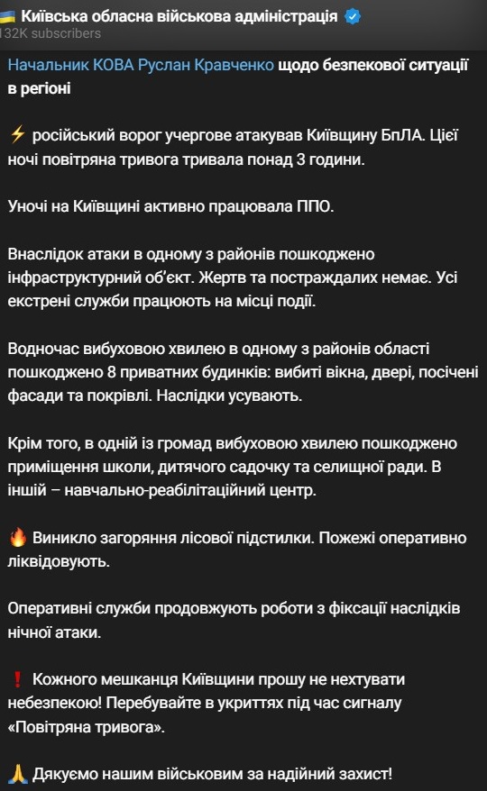 Сегодня ночью Киевскую область атаковали беспилотники, воздушная тревога длилась более 3 часов. В результате атаки повреждены инфраструктурный объект, частные дома, школа, детсад и поселковый совет. Жертв и пострадавших нет.