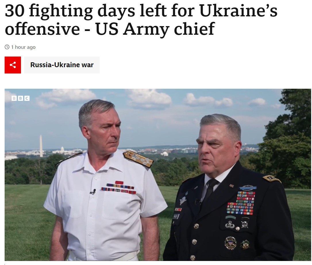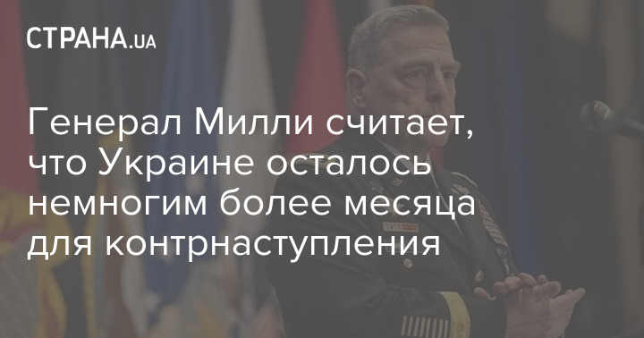 Глава Комитета начальников штабов США Марк Милли заявил, что Украине осталось немногим более месяца для контрнаступления.