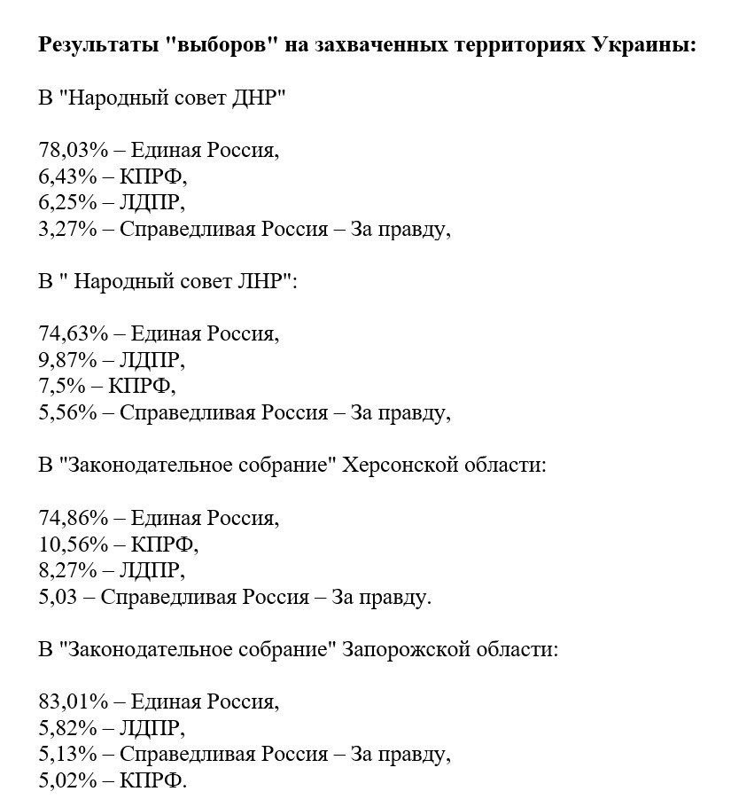 В "новых регионах" везде подавляющее большинство голосов взяла партия "Единая Россия" (74-83%). Второе и третье места делят между собой коммунисты и ЛДПР. Партия "Справедливая Россия - За правду" на всех оккупированных территориях заняла четвертое место, и только в Запорожской области вышла на третье, потеснив КПРФ.