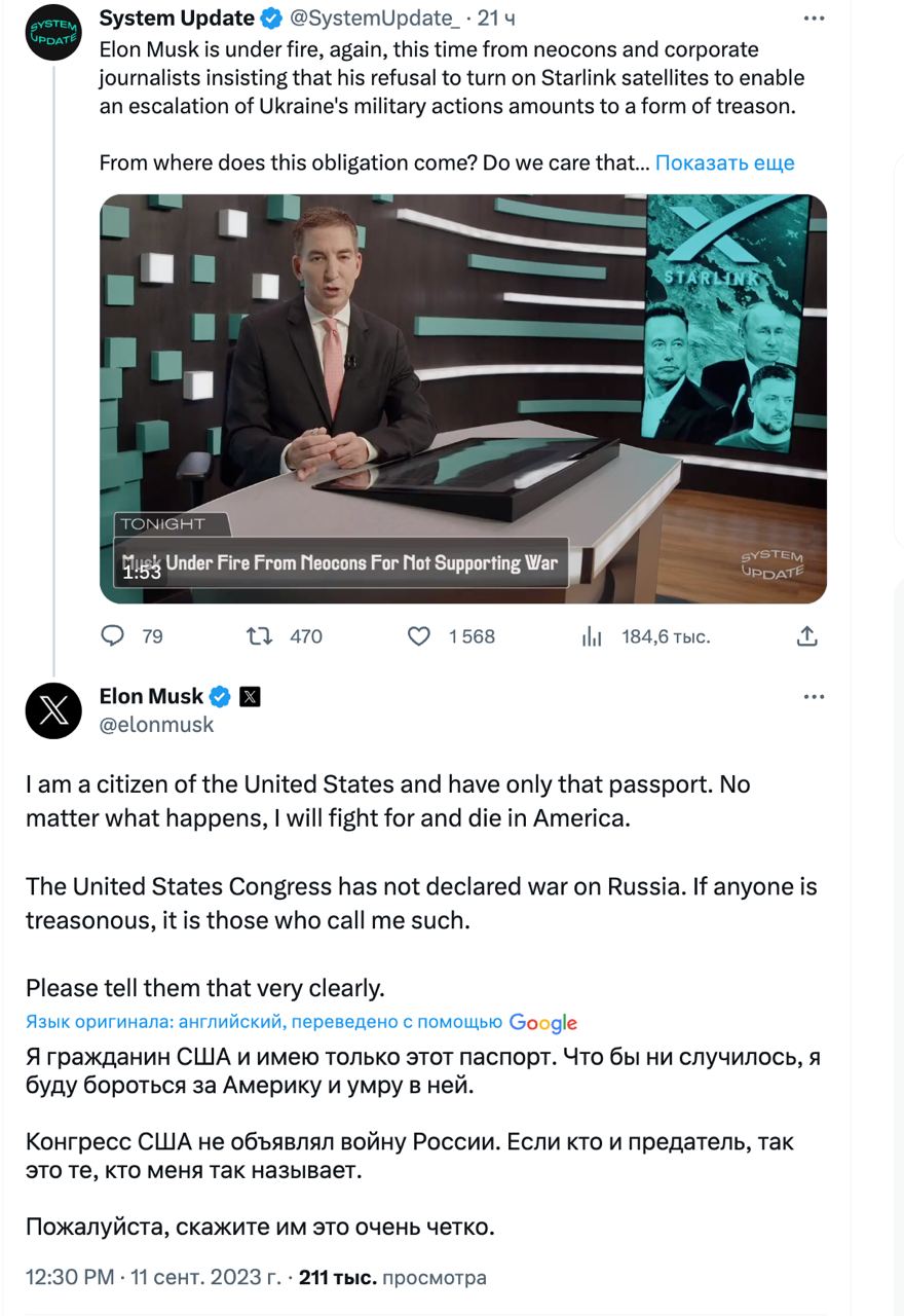 "Я гражданин США и имею только этот паспорт. Что бы ни случилось, я буду бороться за Америку и умру в ней. Конгресс США не объявлял войну России. Если кто и предатель, так это те, кто меня так называет", - ответил Маск в своей соцсети.